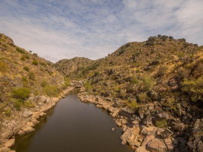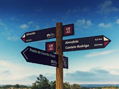 Leaving Soito, next to the chapel of São Brás, it crosses the road and turns right on a cobbled road. From there, it goes down walled paths between farming fields and it passes the Alfaiates stream, to find the dam further ahead and then the village that gives it its name. Crossing Alfaiates, the route heads towards Rebolosa where, next to the Bullring, it reaches a path that goes up to Cesarão river. It follows this river, first until the village of Ribeira, then until Vilar Maior, passing through livestock farming fields, with cattle gates on the way. In Vilar Maior, it crosses the village and continues along the Medieval Bridge over the Cesarão river, rising towards Malhada Sorda. It crosses the village and goes down dirt roads to the place of Medronhal, near the Côa river. There the stone railway bridge across the valley can be seen. The route moves away from the river and begins to go up to Freineda, passing through the centre of the village and leaving it, heading west. It crosses the railway line and starts to go down the Côa valley, crossing the river by a riverside beach (the crossing may not be possible during winter; check the map for an alternative way). Then begins a demanding climb to the HV of Castelo Mendo. Leaving the Historical Village of Castelo Mendo due north, this section follows along plateaus overlooking the Côa. It starts as a dirt road to the EN16, near which it crosses the A25 by an underpass. From this point, it goes on flat terrain and again on dirt road to Leomil, then passing by Ansul and arriving at Aldeia Nova, always in the same kind of environment. Continuing on the plateau, the route meets the EN340, where it joins the Côa Great Route (GR), to jointly cross the river over the old bridge and go up ancestral pathways to the Historical Village of Almeida, parting just before it.