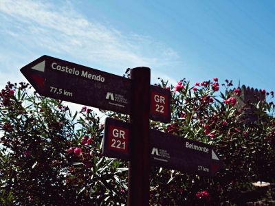 Leaving the Historical Village of Belmonte, the route begins by following the bike path next to the Castle. After descending for a little while, it crosses the national road and, shortly thereafter, it follows east, to cross the motorway and the railway. It crosses the Inguias stream together with the tar road and, already on the other bank, it goes up the valley as a dirt track. The route leaves this valley, which is now called Quarta-feira, and goes around Serra da Pedra Furada, thus revealing the Historical Village of Sortelha. Together with the local PR, it goes up drovers' routes and Roman and medieval stone roads, reaching the Castle’s west door, next to the old hospital. Continuing from Devesa, going up close to Portela de Sortelha, at a height of about 800m. From there, it begins to descend, crossing the Nave stream and the tar road. The descent continues along a dirt road towards Urgueira, where it separates from the Meimoa-Sortelha Dam leg. After passing the centre of the village of Urgueira, the route turns northeast towards the Côa valley, to Souto do Rio, where it turns right, before crossing the river and going up to the castle of Sabugal. Before going up to the Castle, the GR22 crosses the GR of the Côa valley, which follows the river from its source to its mouth. After crossing the old centre, the route takes a right on Praça da República towards the industrial area, circling it from the south and turning right, to the east, in an unpaved path. It passes the Arnes stream and continues until it meets the road, near the village of Torre. Inside the village, the route turns right onto D. Dinis street and just outside the village it turns left, entering a series of pathways to the road that goes into Ozendo from the south. Going north from the Amoreira street, the route crosses a less populated area, passing by marshes on the way to Soito, which is reached from the northwest.